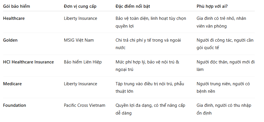 Để dễ hình dung, bạn có thể chia các gói theo 3 nhóm nhu cầu phổ biến:- Gói Cơ bản: tập trung quyền lợi nội trú, phù hợp người trẻ, ngân sách vừa phải