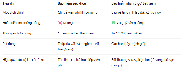 Khác với bảo hiểm nhân thọ (chi trả khi tử vong) hay bảo hiểm tiết kiệm (có lãi, hoàn tiền), thì:Bảo hiểm sức khỏe là loại bảo hiểm phi nhân thọ, được thiết kế để:
