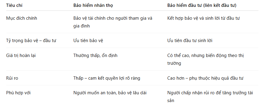 Tùy thuộc vào mục tiêu cá nhân, bạn có thể cân nhắc:- Nếu bạn ưu tiên bảo vệ bản thân và gia đình, mong muốn an tâm trước rủi ro, thì bảo hiểm nhân thọ truyền thống là lựa chọn phù hợp.