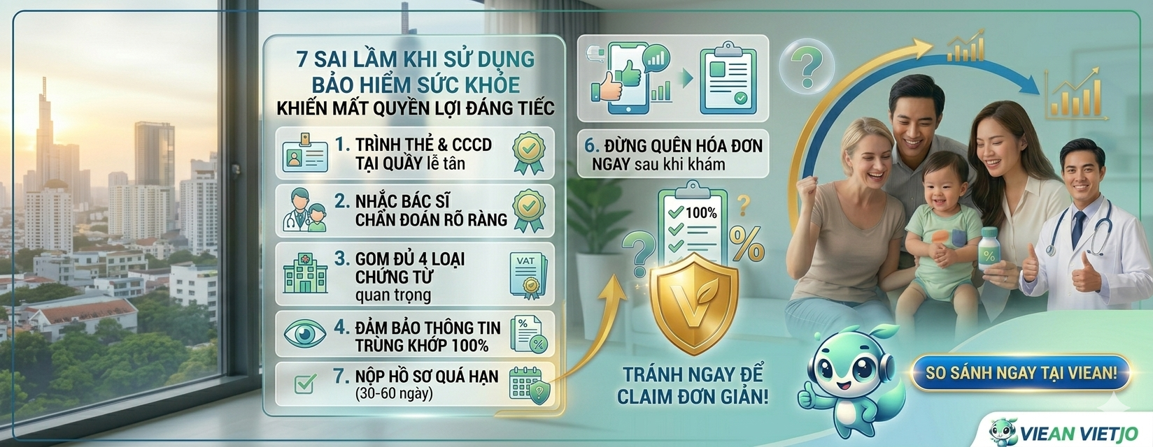 Bạn hãy thanh toán trước, lấy đầy đủ chứng từ (Hóa đơn VAT, sổ khám, đơn thuốc) và nộp hồ sơ bồi thường sau. VieAn sẽ hỗ trợ bạn theo dõi tiến độ chi trả của hãng bảo hiểm.Kết luận: Bảo hiểm chỉ "khó" khi chúng ta chưa nắm rõ luật chơi. Chỉ cần tránh được 7 sai lầm trên, tấm thẻ sức khỏe của bạn sẽ thực sự trở thành người bạn đồng hành tài chính đáng tin cậy.