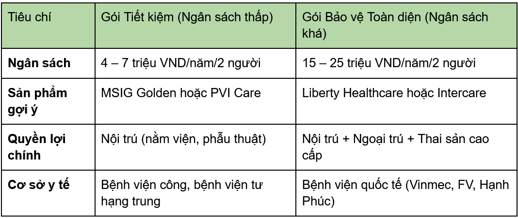 Trên hệ thống so sánh của VieAn, vợ chồng bạn có thể cân nhắc 3 mô hình phổ biến:3. Mua riêng lẻ từng gói cá nhân