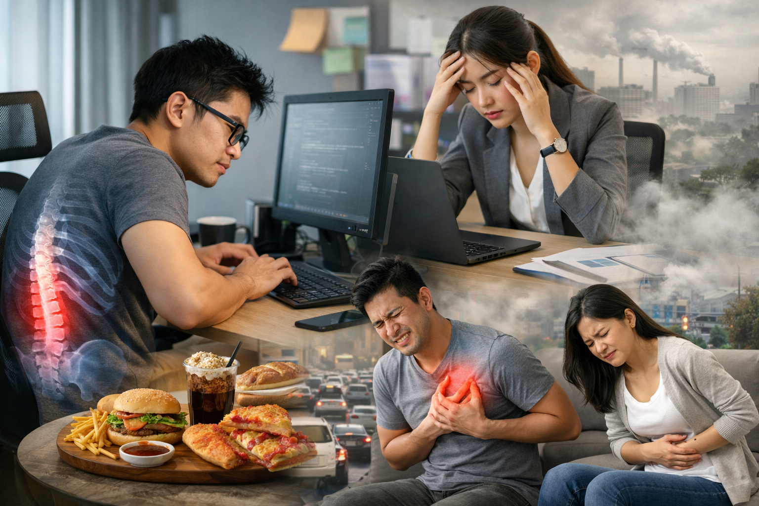 Sự phát triển của công nghệ và nhịp sống đô thị đã mang lại nhiều tiện ích, nhưng đồng thời cũng tạo ra không ít thách thức đối với sức khỏe con người. Lối sống hiện đại ngày nay thường gắn liền với:- Ít vận động, ngồi nhiều trước máy tính